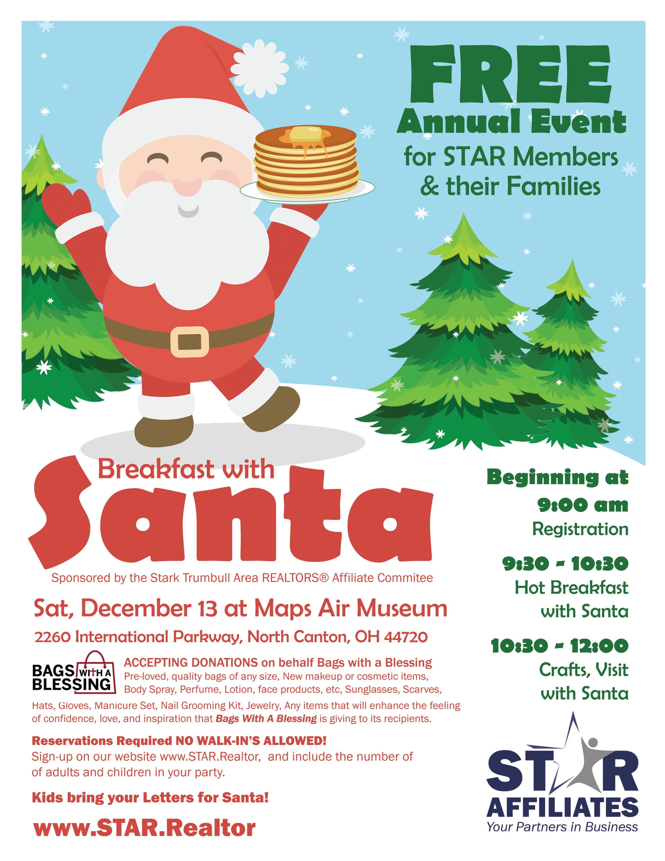 Annual Breakfast with Santa Event, brought to you by the Affiliate Committee. This event is FREE for STAR Members and their families! ACCEPTING DONATIONS on behalf Bags with a Blessing. Pre-loved, quality bags of any size, new makeup or cosmetic items, body spray, perfume, lotion, face products, etc. Sunglasses, scarves, hats, gloves, manicure set, nail grooming kit, jewelry, any items that will enhance the feeling of confidence, love, and inspiration that Bags with A Blessing is giving to its recipients. When registering please add # of Adults and # of Children when it asks. Thank you.Images